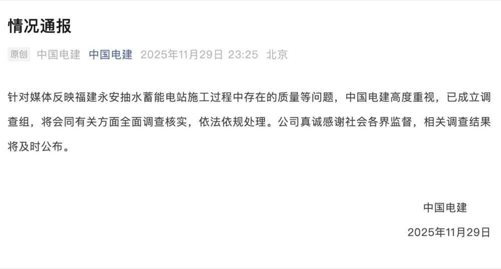 PowerChina untersucht Qualitätsprobleme beim Pumpspeicherkraftwerk in Fujian